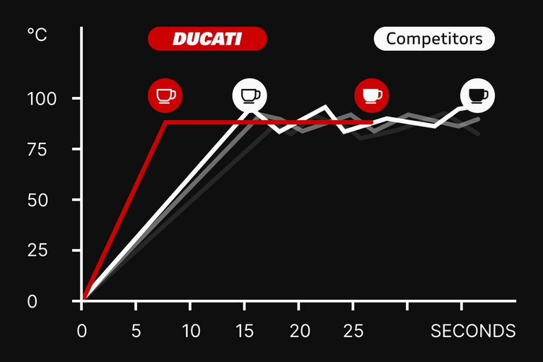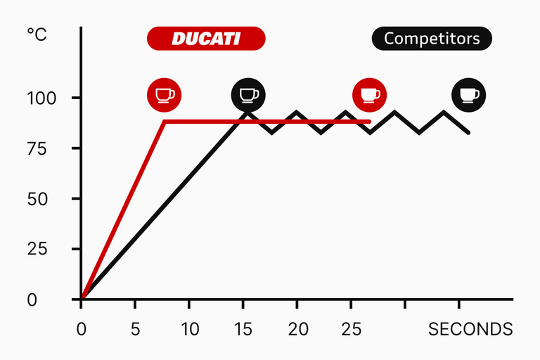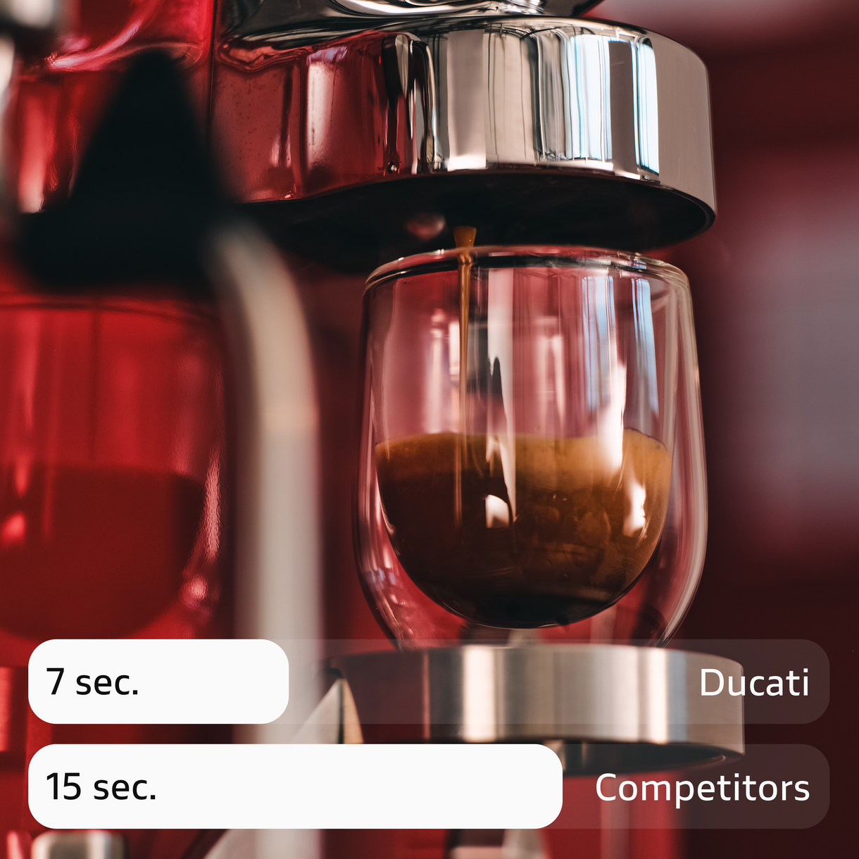 Sperimentate il futuro dell'erogazione del caffè con la rivoluzionaria partenza a freddo in 7 secondi di Barista M3 by Ducati. Grazie all'elemento riscaldante appositamente sviluppato, la macchina è pronta per l'erogazione in meno di sette secondi.