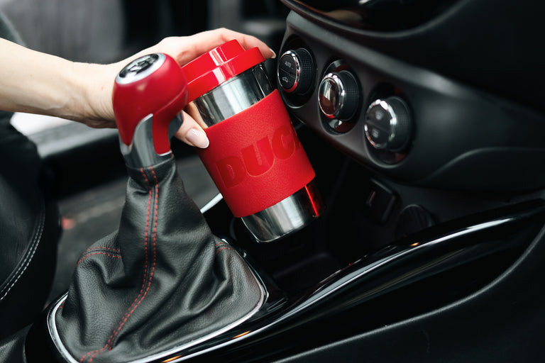 La tazza inclusa per la Barista M3 di Ducati si adatta perfettamente al portabicchieri della vostra auto. Così potrete godervi il vostro caffè o cappuccino mentre andate al lavoro.