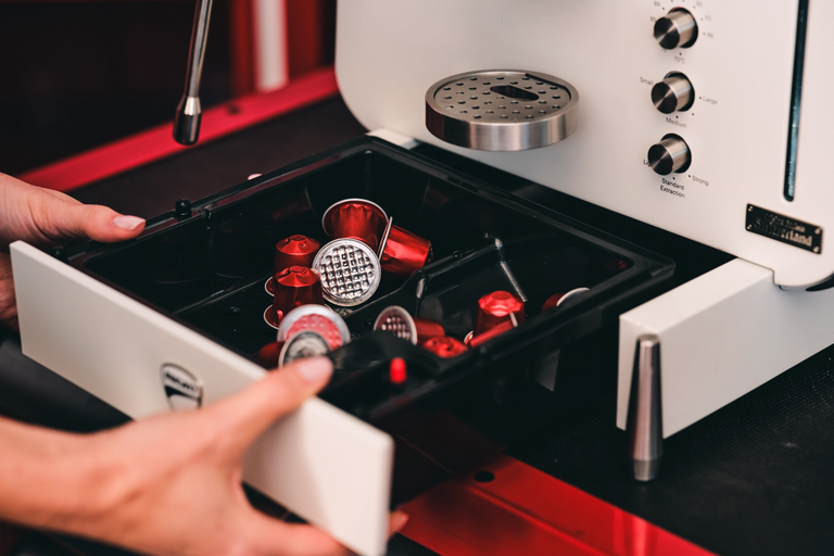 Il contenitore per capsule Barista M3 by Ducati può contenere fino a 20 capsule usate, riducendo la necessità di svuotarle frequentemente e mantenendo in ordine il piano di lavoro.